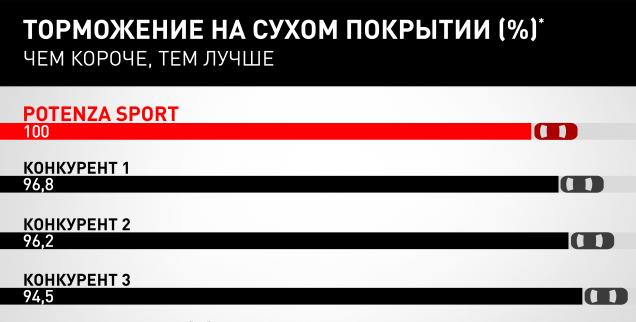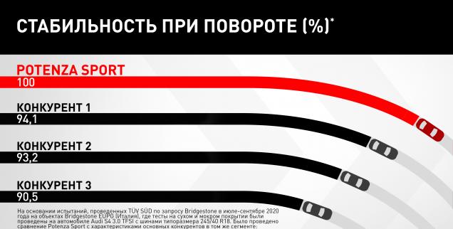 2На основании испытаний, проведенных TÜV SÜD по запросу Bridgestone в июле-сентябре 2020 года на объектах Bridgestone EUPG (Италия), где тесты на сухом и мокром покрытии были проведены на автомобиле Audi S4 3.0 TFSI с шинами типоразмера 245/40 R18. Было проведено сравнение Potenza Sport с характеристиками основных конкурентов в том же сегменте: Continental Premium Contact6, Michelin Pilot Sport 4, Goodyear Eagle F1 Asymmetric 5, Pirelli P Zero PZ4. Приложение-Отчет № [713190691-PS].